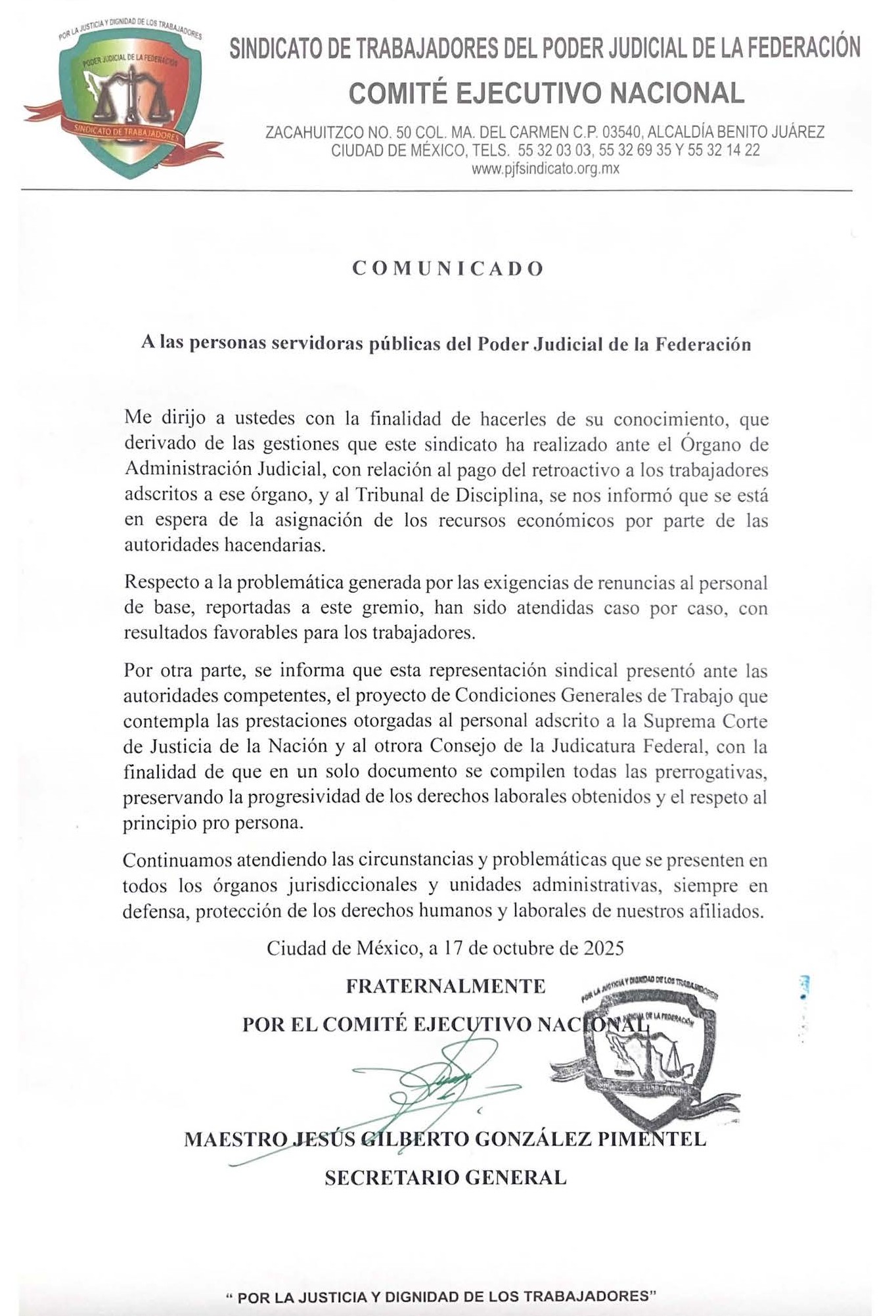 Comunicado del 17/10/2025. Dirigido a todas las personas servidoras públicas del Poder Judicial de la Federación
